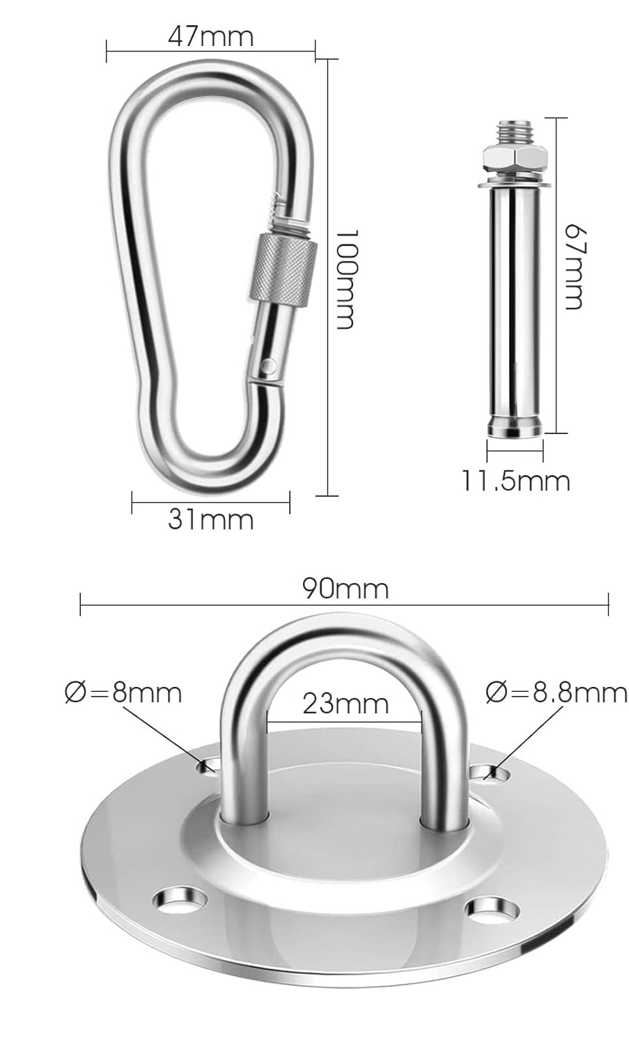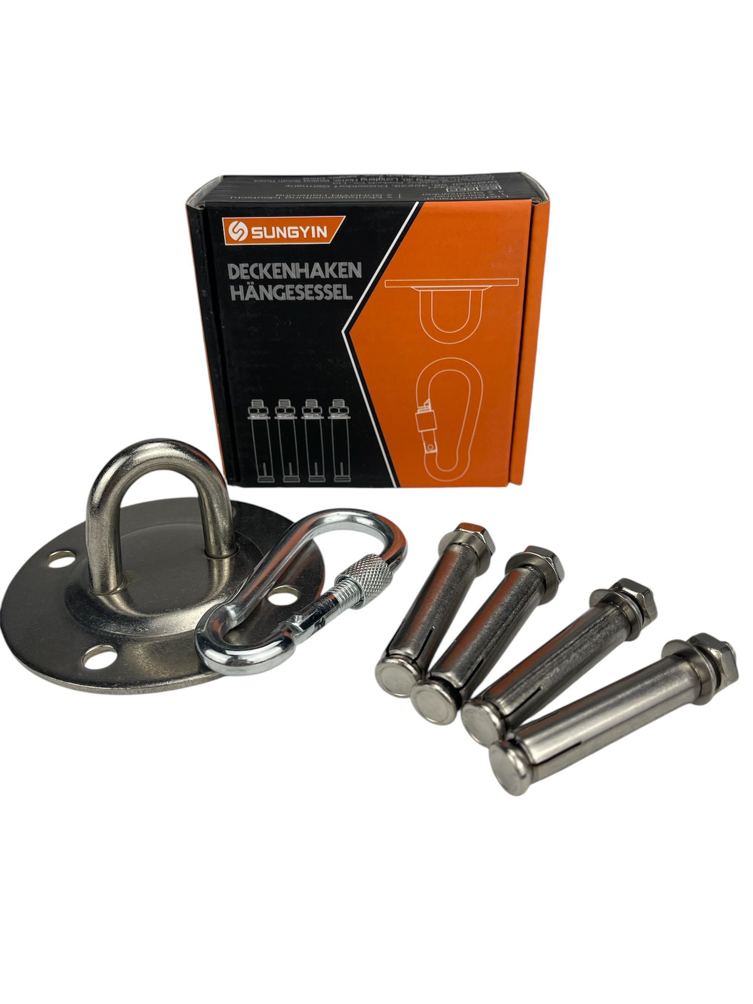 - El paquete incluye: 1 soporte de techo, 4 tacos de metal (para techos de hormigón macizo), 1 mosquetón con dispositivo de seguridad, 1 instrucciones de montaje detalladas (idioma español no garantizado).