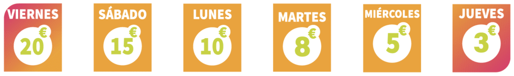 Reponemos mercancía nueva cada día, pero los viernes es cuando llegan a nuestras tiendas productos de nivel superior. Este día la mayoría de productos estarán disponibles por tan solo 20€. A partir de entonces cada día encontrarás en nuestras tiendas productos muy interesantes a precios inferiores (sábado 15€, lunes 10€, martes 8€ , miércoles 5€ y jueves 3€).