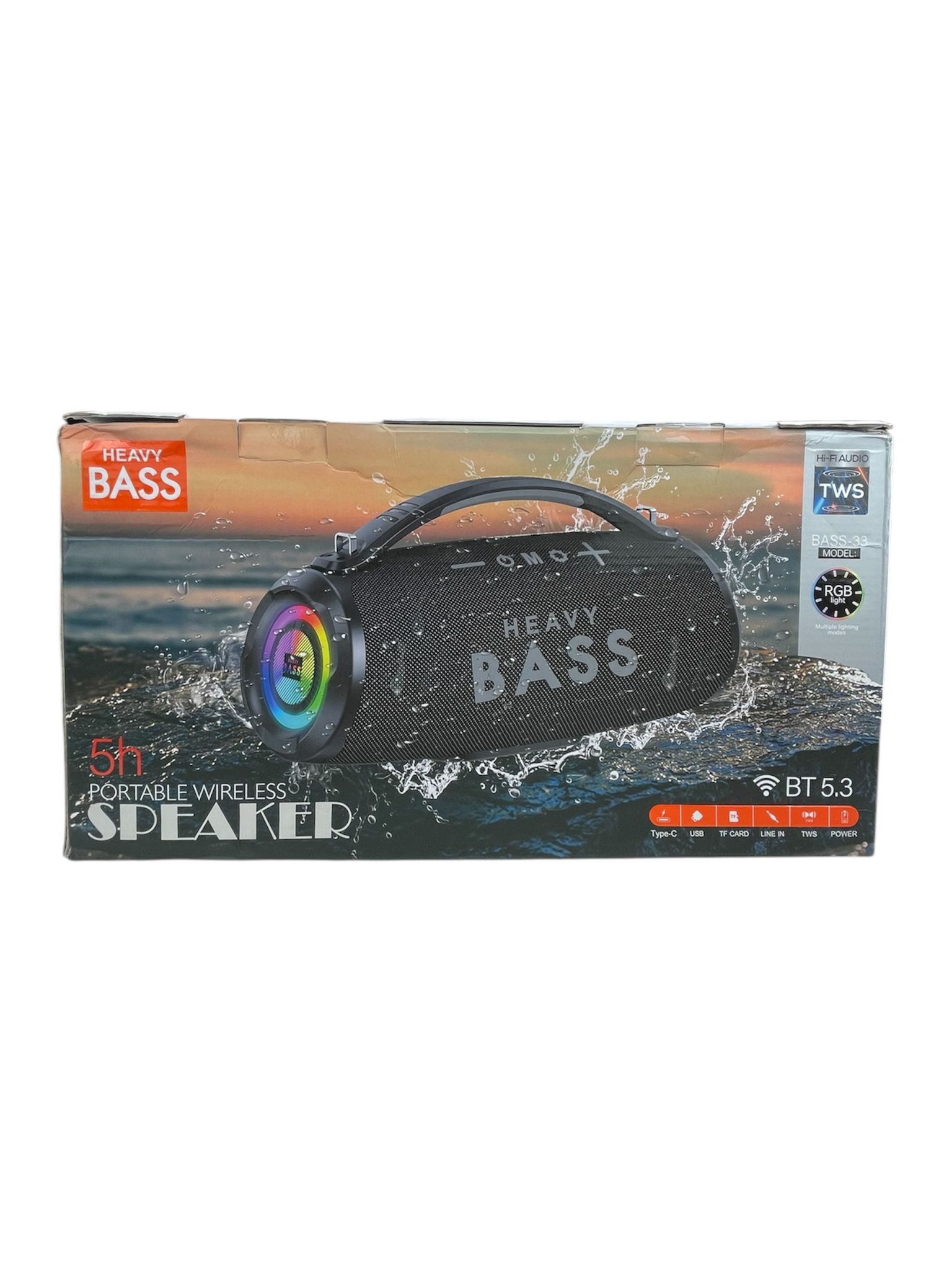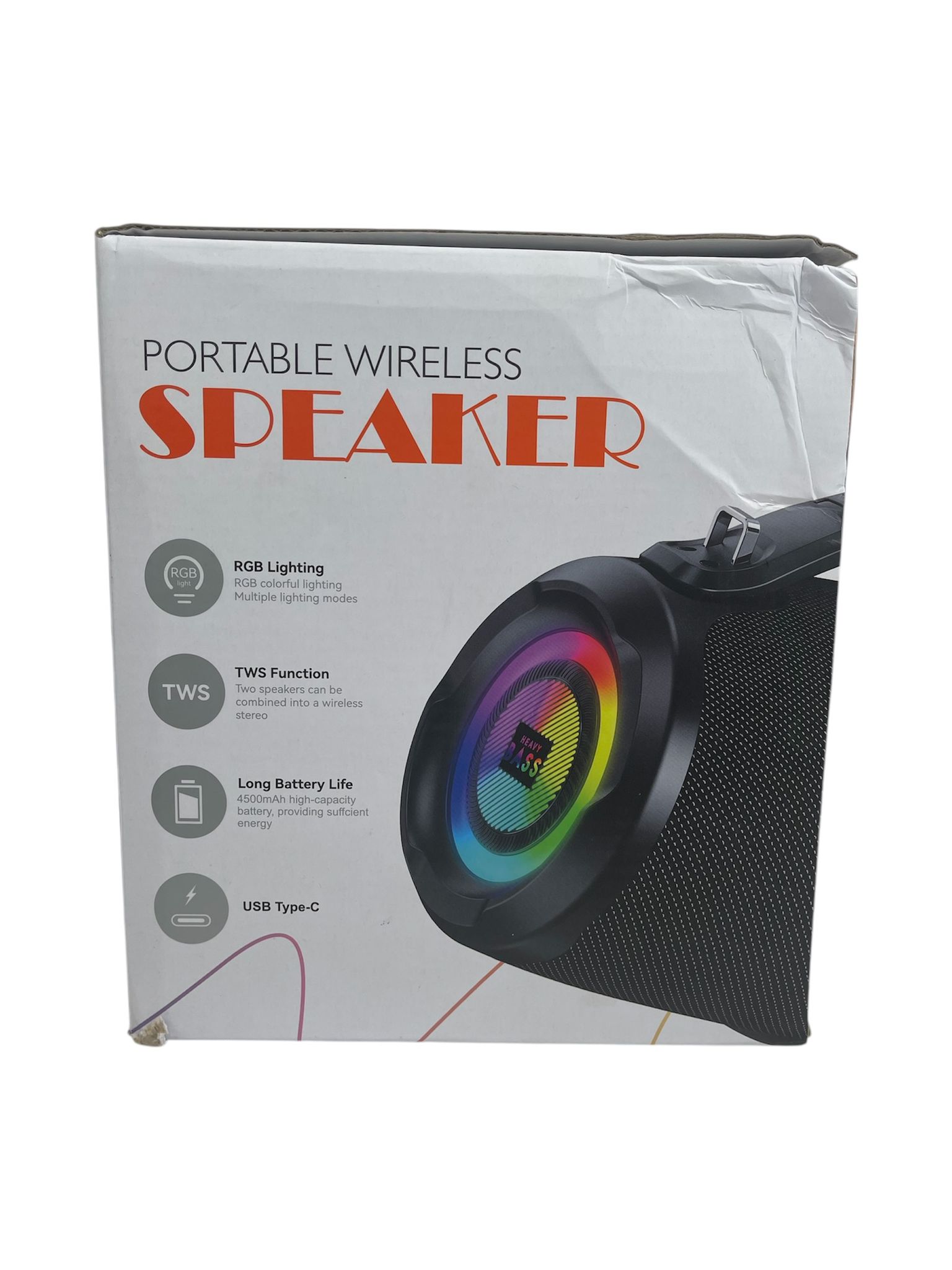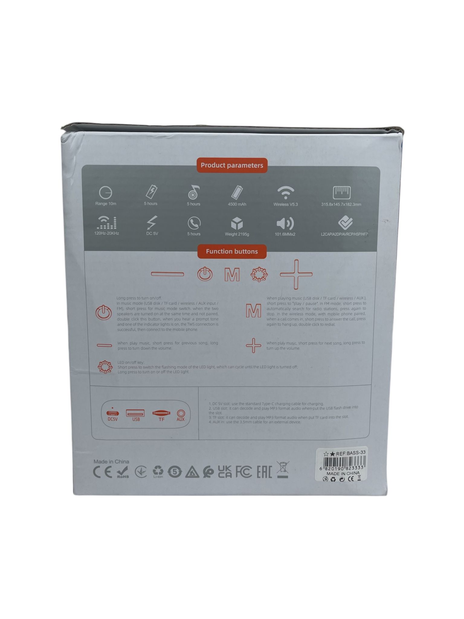 Altavoz portátil, 5h de autonomía, con luces led, opción de conectar dos altavoces mediante wifi, entrada de carga USB tipo C. 10 metros de rango, acepta pilas 4500 mAh, Wireless V5.3, DC 5V.